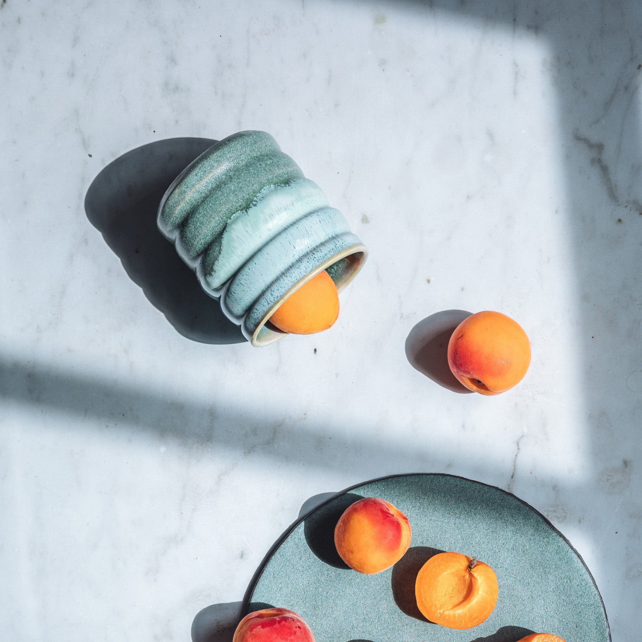 - Smalto in gres dai colori intensi, opaco e setoso, con delicate sfumature verde-blu-grigio.